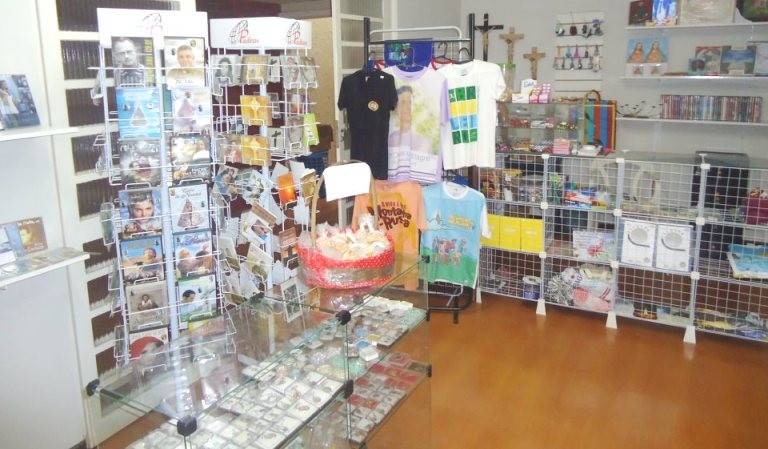 Contamos com uma grande variedade de produtos de evangelização: Imagens, CD's, DVD's, Camisetas, Terços, Biblias, Escapulários, Anéis... e ao lado uma lanchonete com salgados, doces, café...